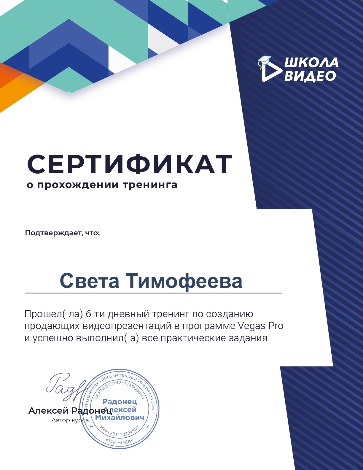 Обучение: Школа Видео Радонец Алексея: сертификат по созданию Продающих видео презентаций. Постоянное участие в клубе видеомонтажа.